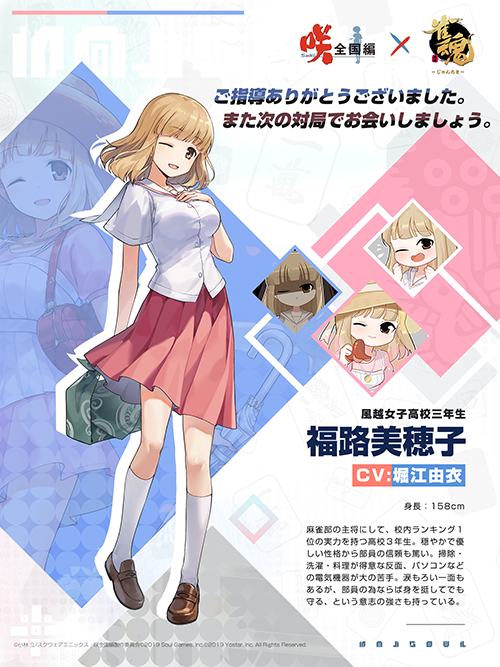 さらに期間限定ガチャでは、コラボ雀士・装飾品ピックアップが排出された。コラボ雀士は、宮永 咲(CV:植田 佳奈)、原村 和(CV:小清水 亜美)、宮永 照(CV:中原 麻衣)、天江 衣(CV:福原 香織)の4人。