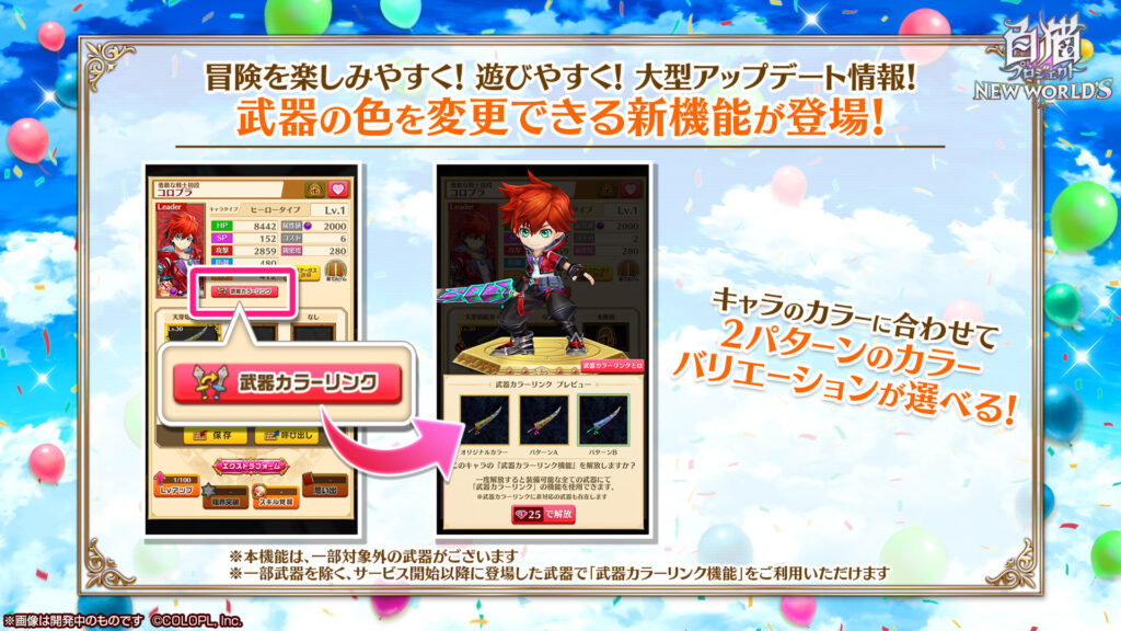 なかでも「武器カラーリンク」は、キャラクターが装備する武器の色を変更できる新機能となっている。キャラクターごとにゲーム内アイテム「ジュエル」を25個消費することで機能がアンロックされ、キャラクターの髪や衣装の色に合わせて2パターンの武器の色パターンが自動生成される。